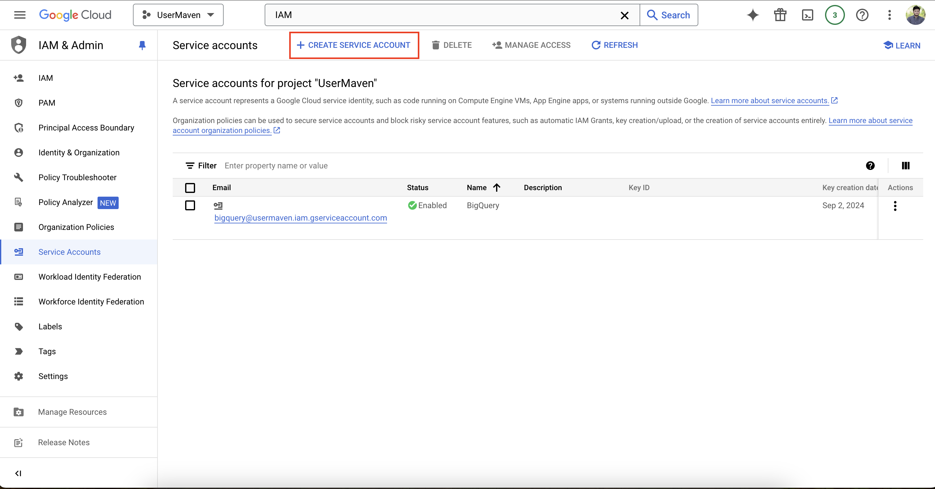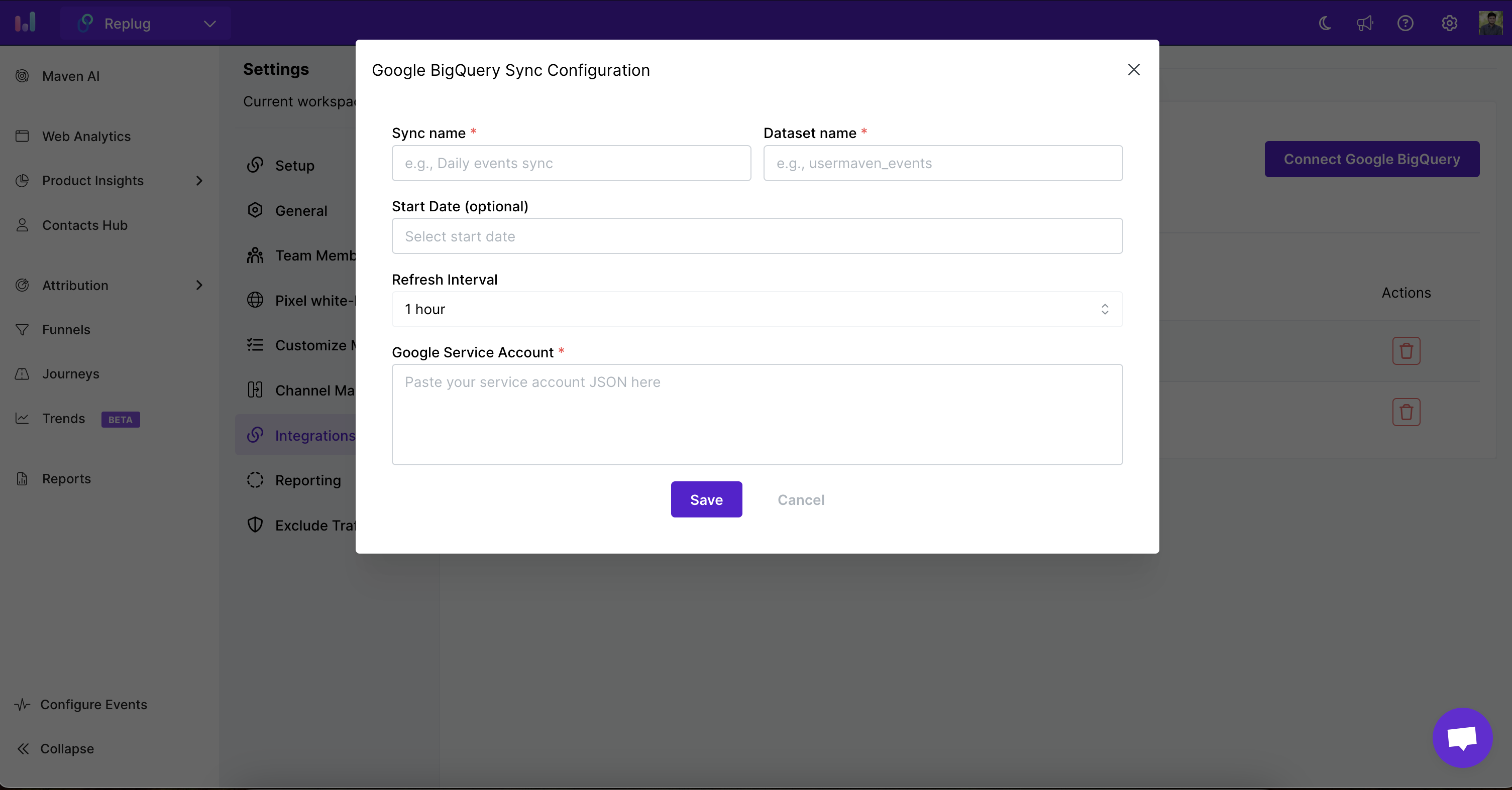 This guide will walk you through the process of connecting Google BigQuery to your Usermaven workspace. This integration allows you to seamlessly transfer raw event data, enabling powerful analytics and insights. Follow these steps carefully to ensure a successful setup.