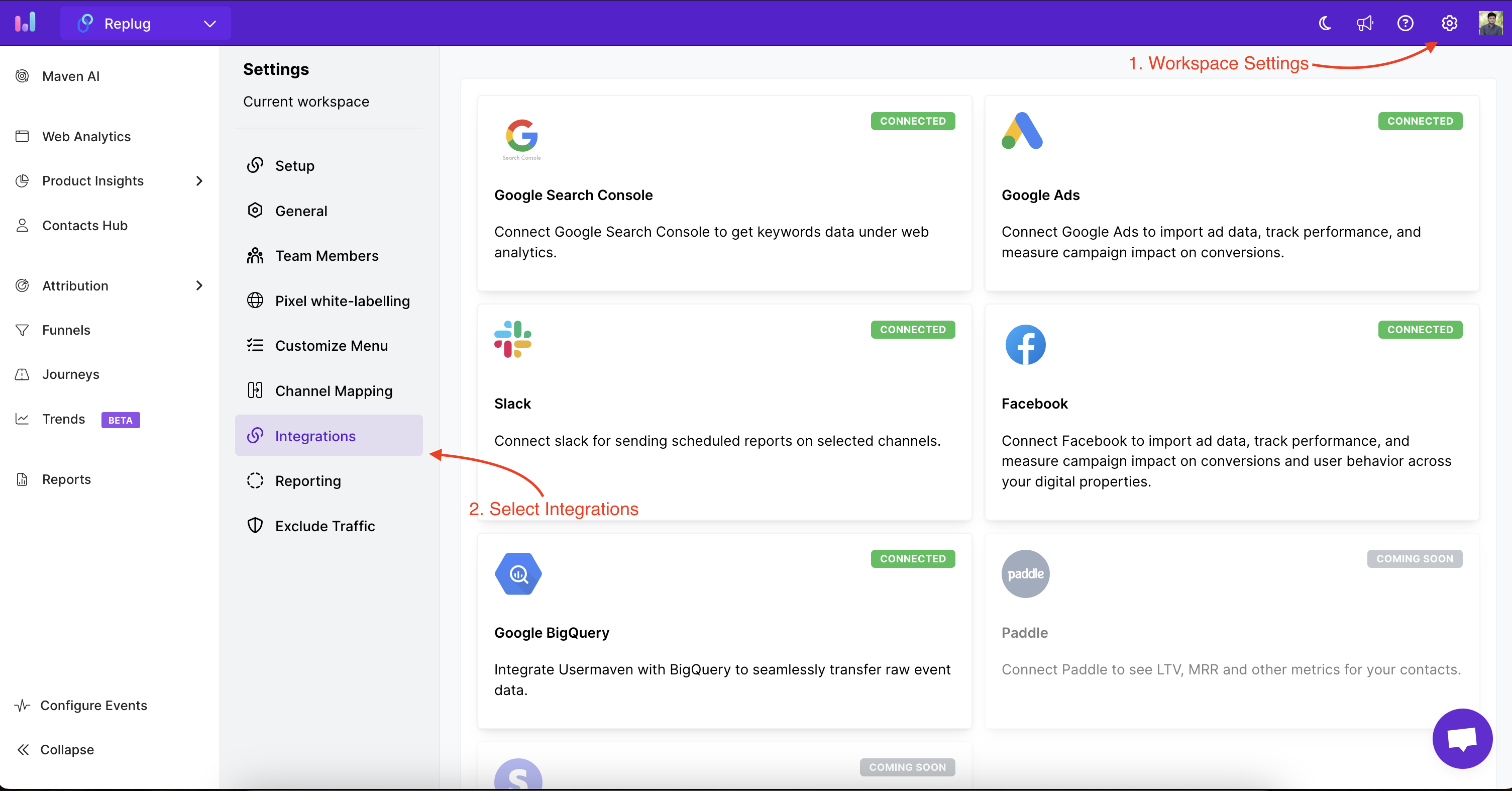 Start by logging into your Usermaven account. Go to "Workspace Settings" and locate "Integrations" section in the main menu. Click on it to view available integrations.