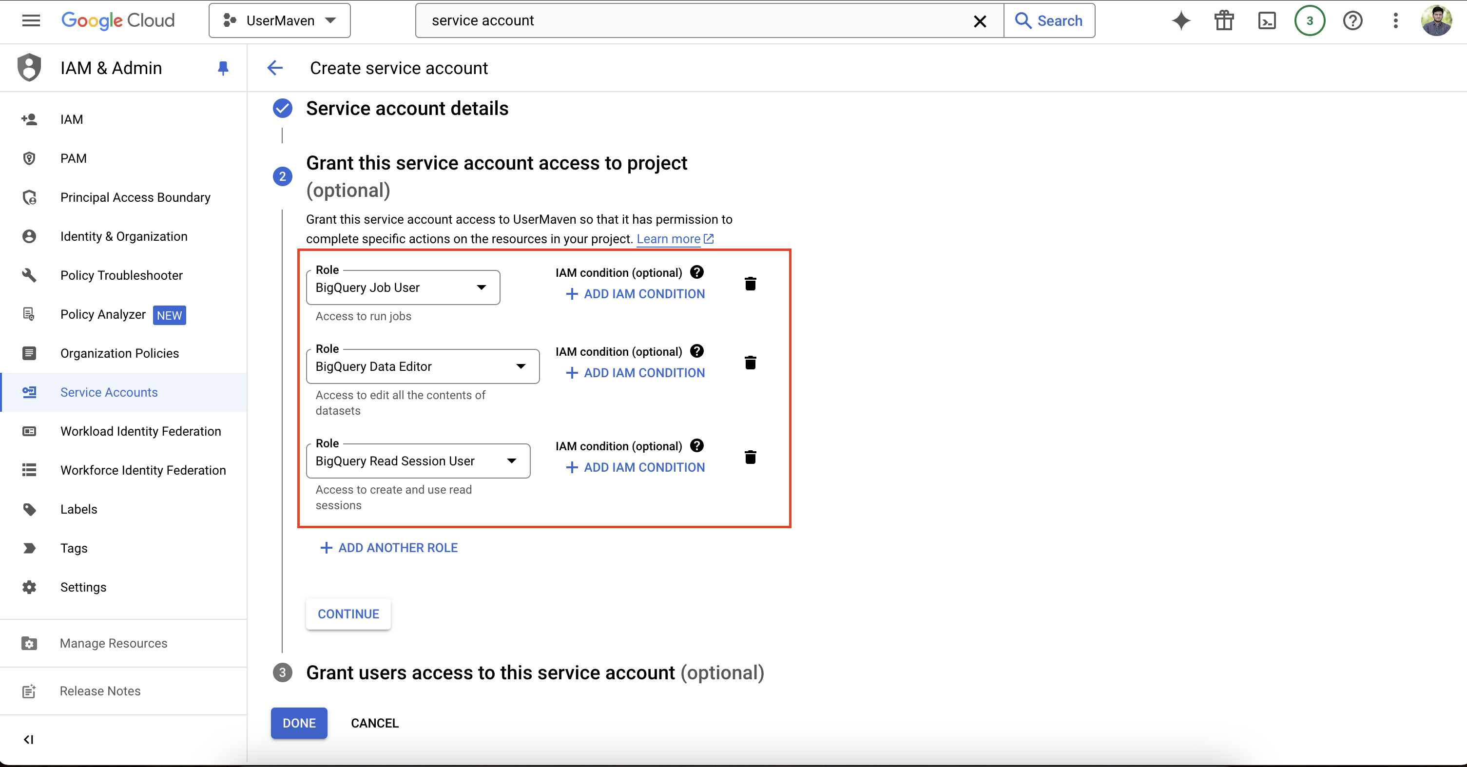 At this stage, it's not necessary to provide user access to the service account. Simply click the Done button to proceed.