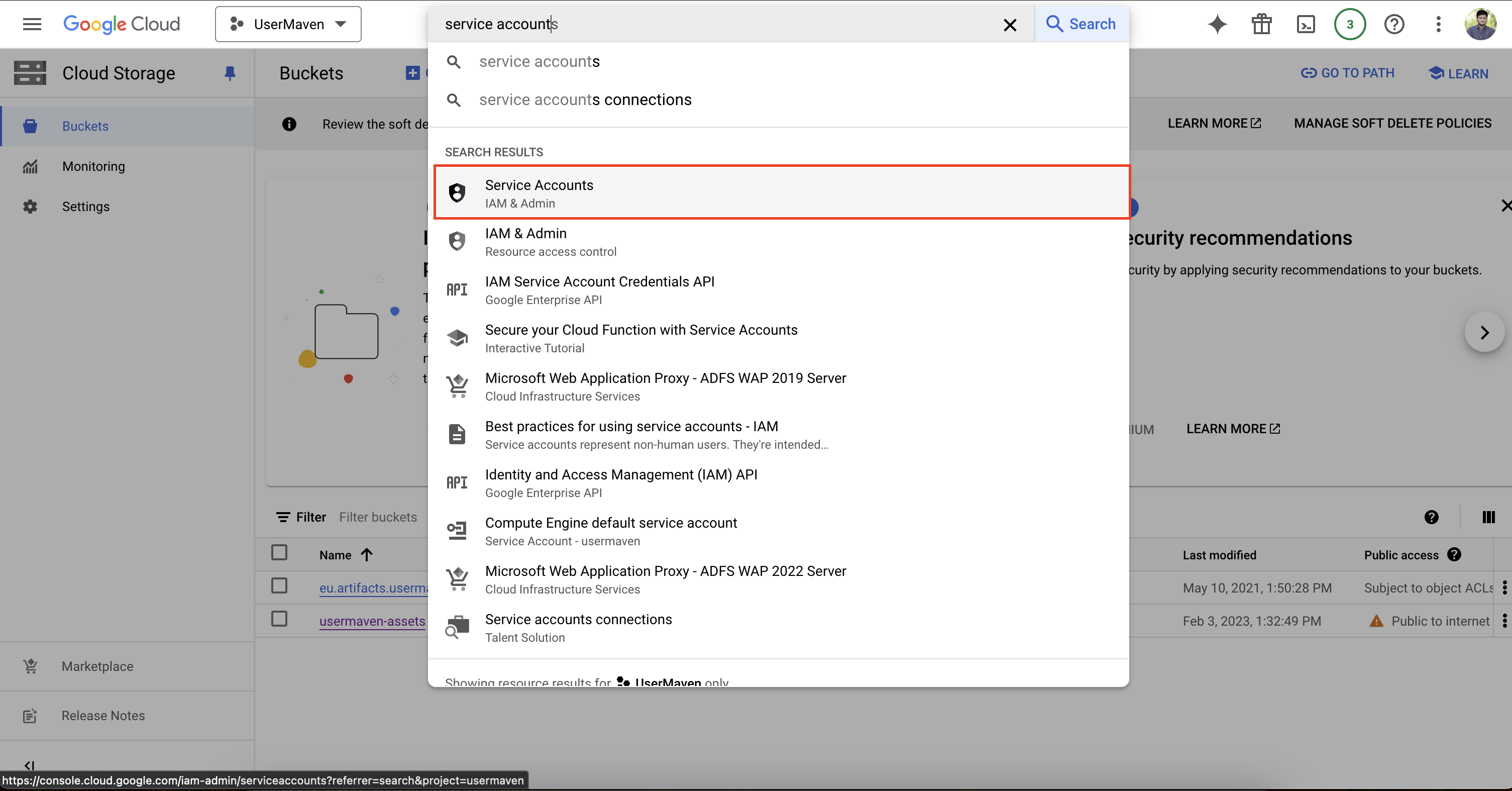 Navigate to the Google Cloud Console and use the search bar to find "Service Accounts". Select "Service Accounts" from the search results.