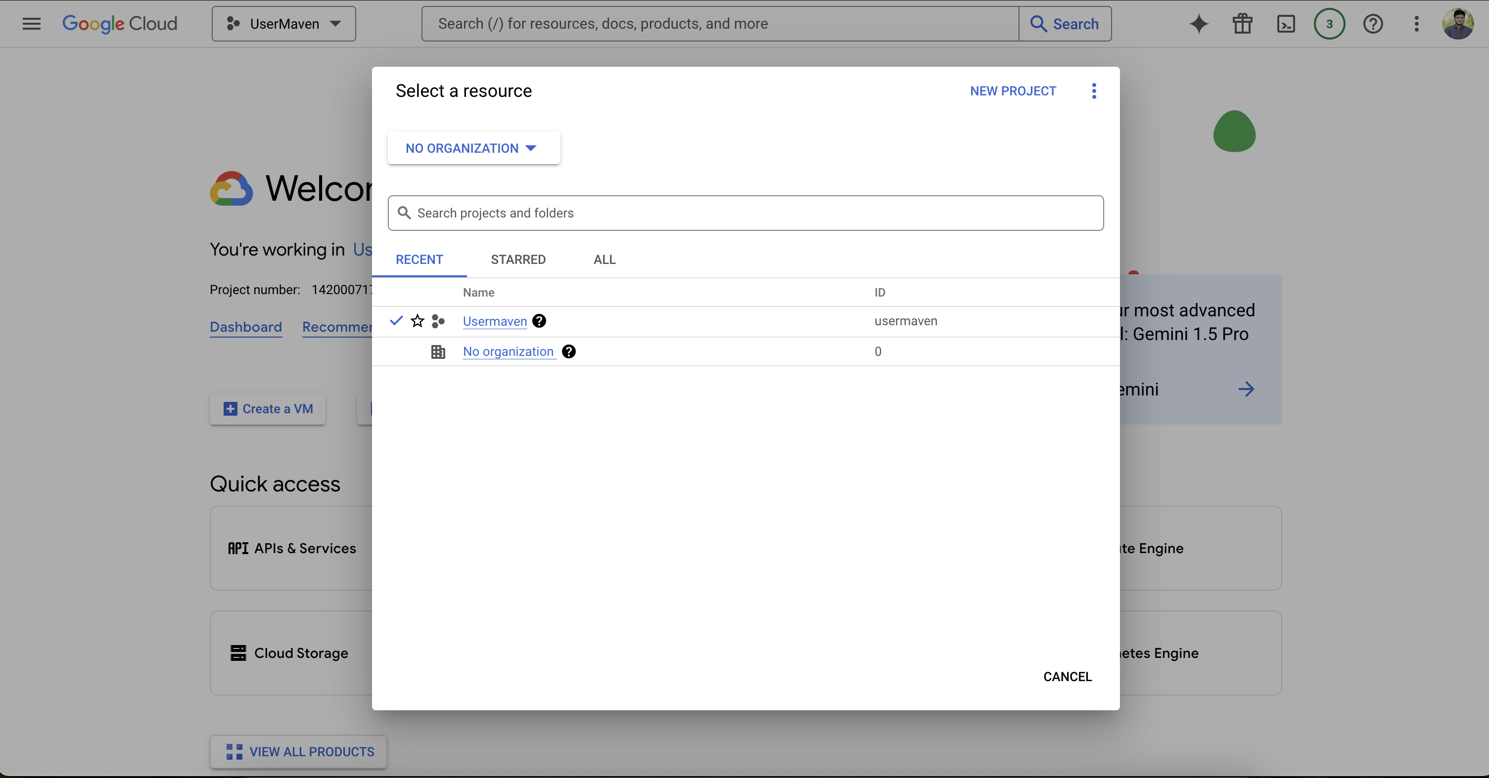 At the Google Cloud Console welcome page, locate the project selector in the top-left corner. Click on it to reveal a dropdown menu. From there, you have two options: