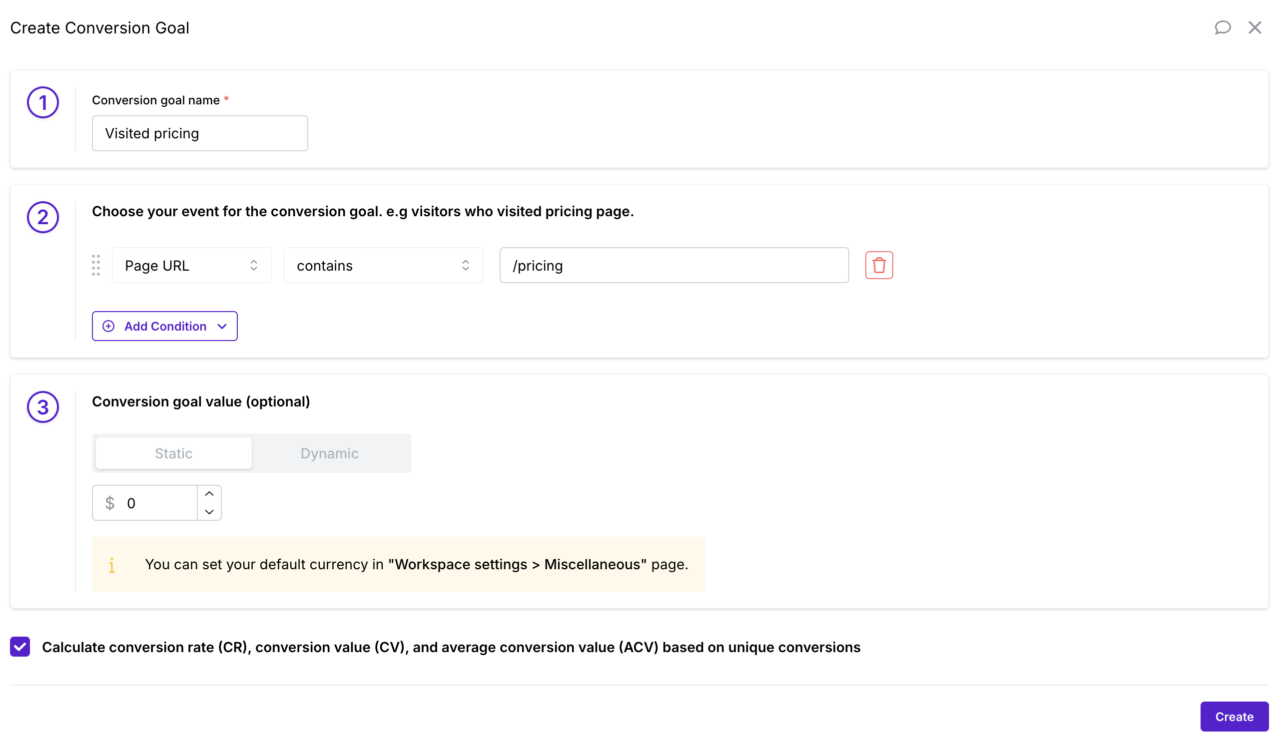Finish Up: Once everything is set, click the "Create" button to save your new conversion goal.