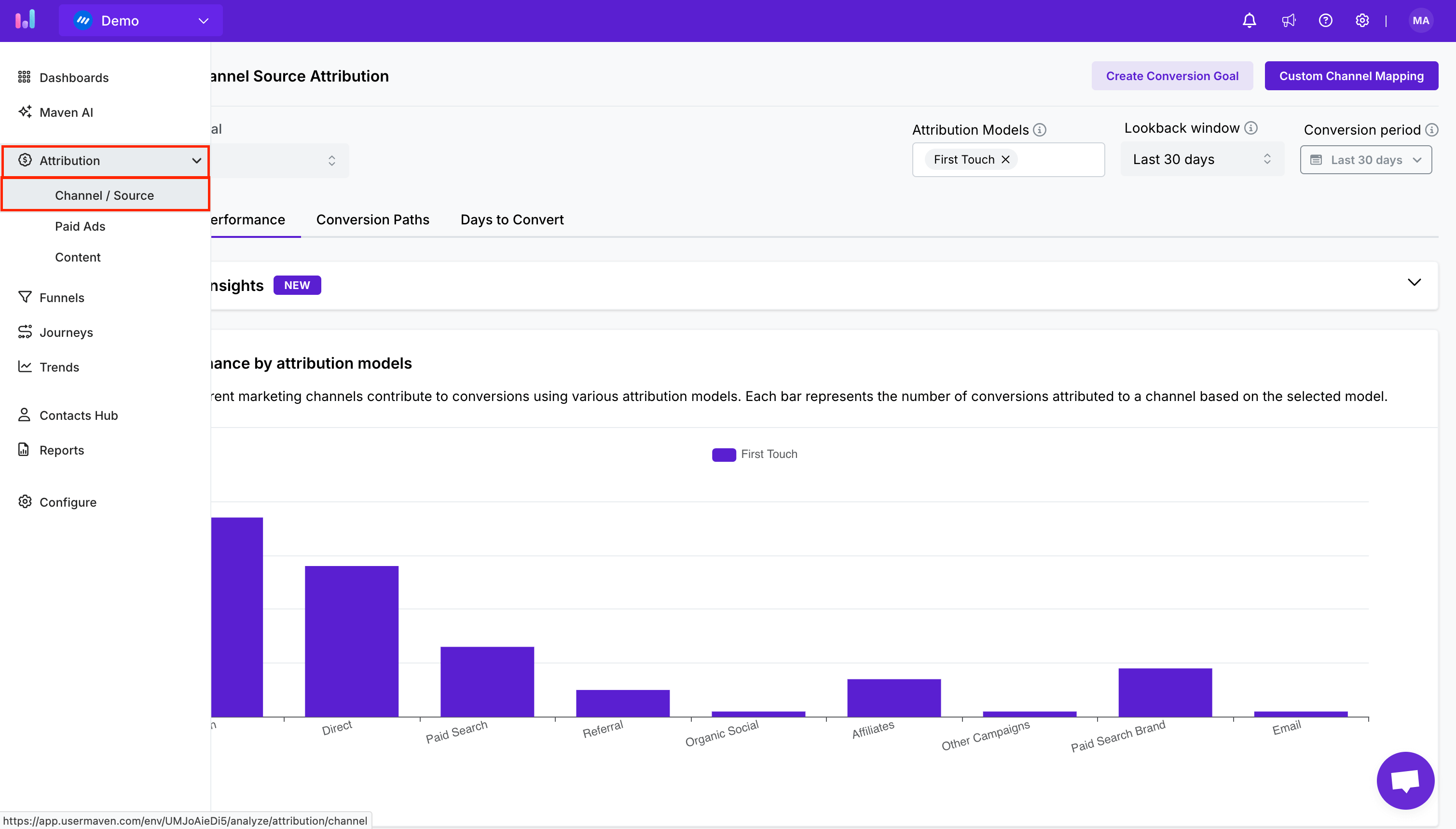 Log in to Usermaven and click “Attribution > Channel/Source” on the left panel to open the dashboard and explore different models.