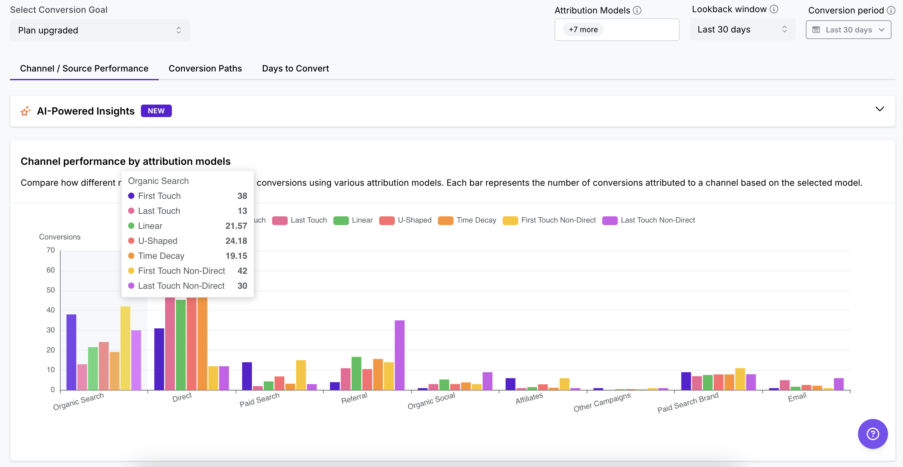 By comparing channels under multiple attribution models, you’ll quickly see whether a channel is better at attracting new visitors or closing the sale. This insight helps you make data-driven decisions about where to focus your marketing efforts and budget, ensuring you invest in the channels that truly deliver the best results.