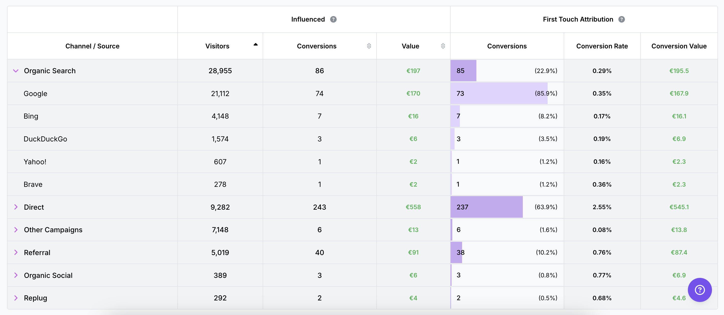 Click on any channel or source to get a more detailed breakdown of how it drives conversions. This lets you dive deeper into a specific channel’s performance and see how it contributes across the various touchpoints.