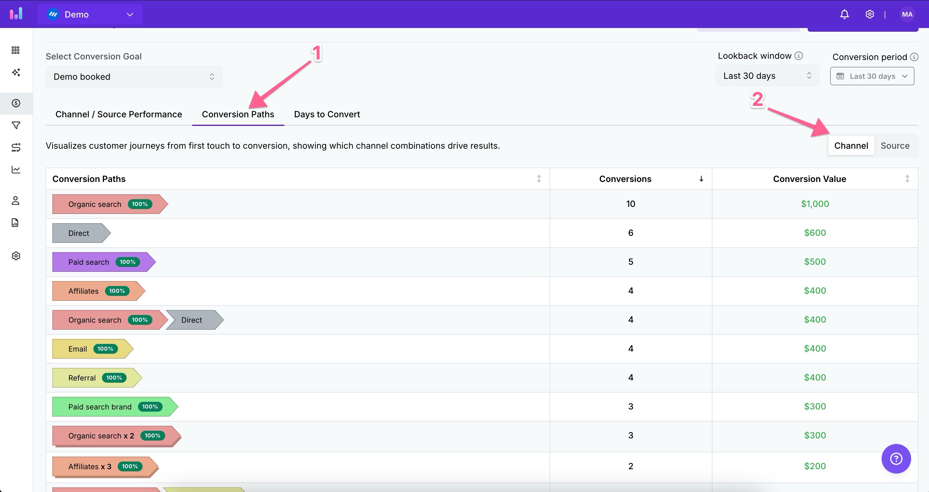 Displays the total number of visitors from that channel who eventually converted, along with the number of conversions and total revenue. This gives you a broad view of the channel’s impact throughout the customer journey.