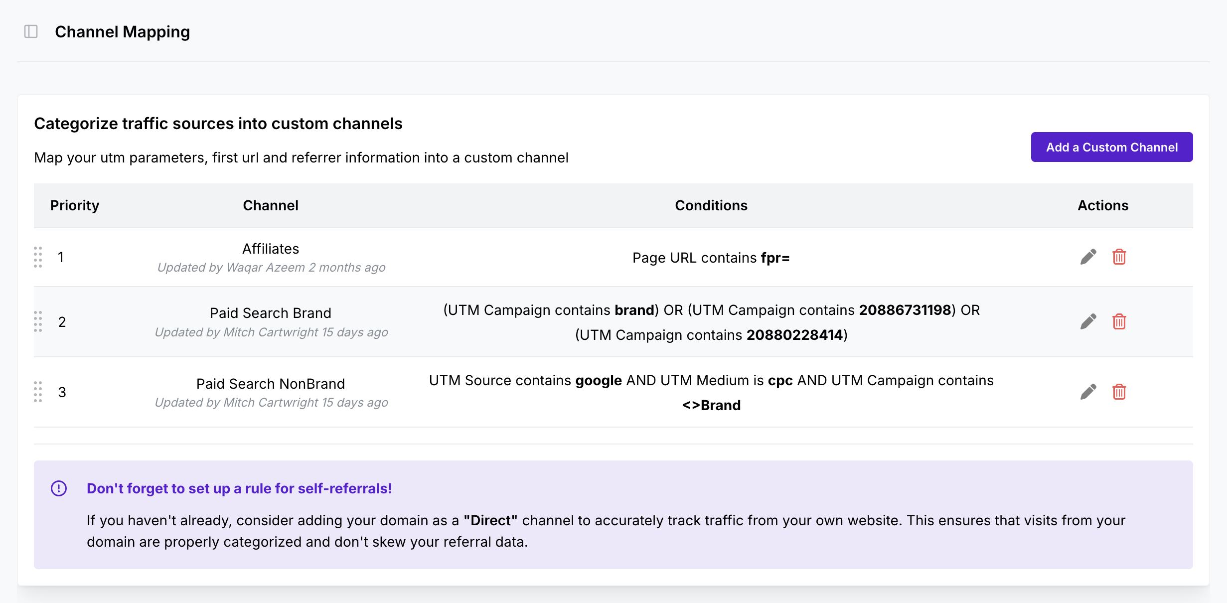 Clicking the Custom Channel Mappingsbutton takes you to a dashboard where you can group your traffic sources however you want.