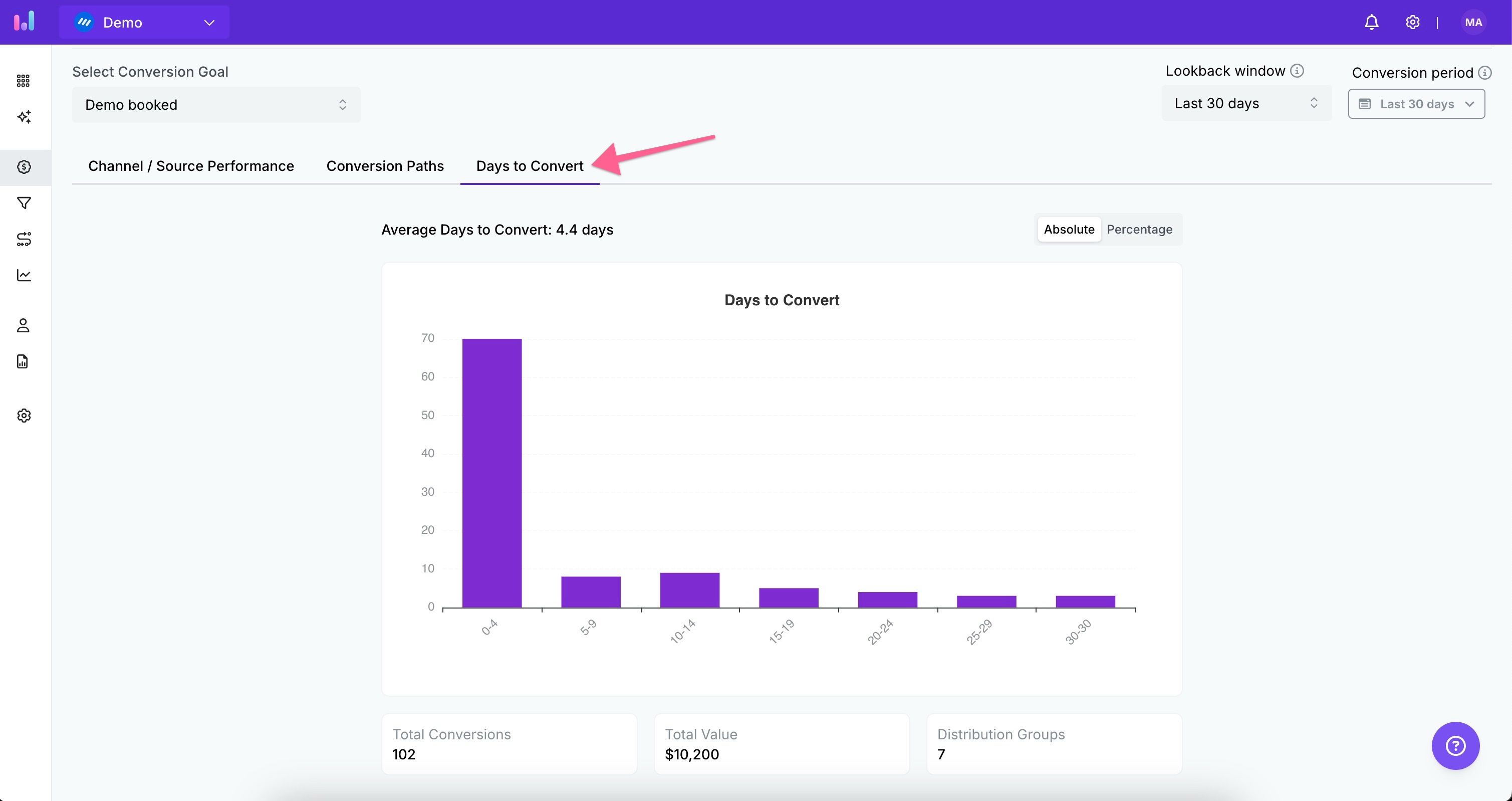 Days to Convert shows how long it takes for a user to go from their first interaction with your brand to a final conversion (like a purchase or sign-up). This helps you see if people convert quickly or need more time and nurturing.