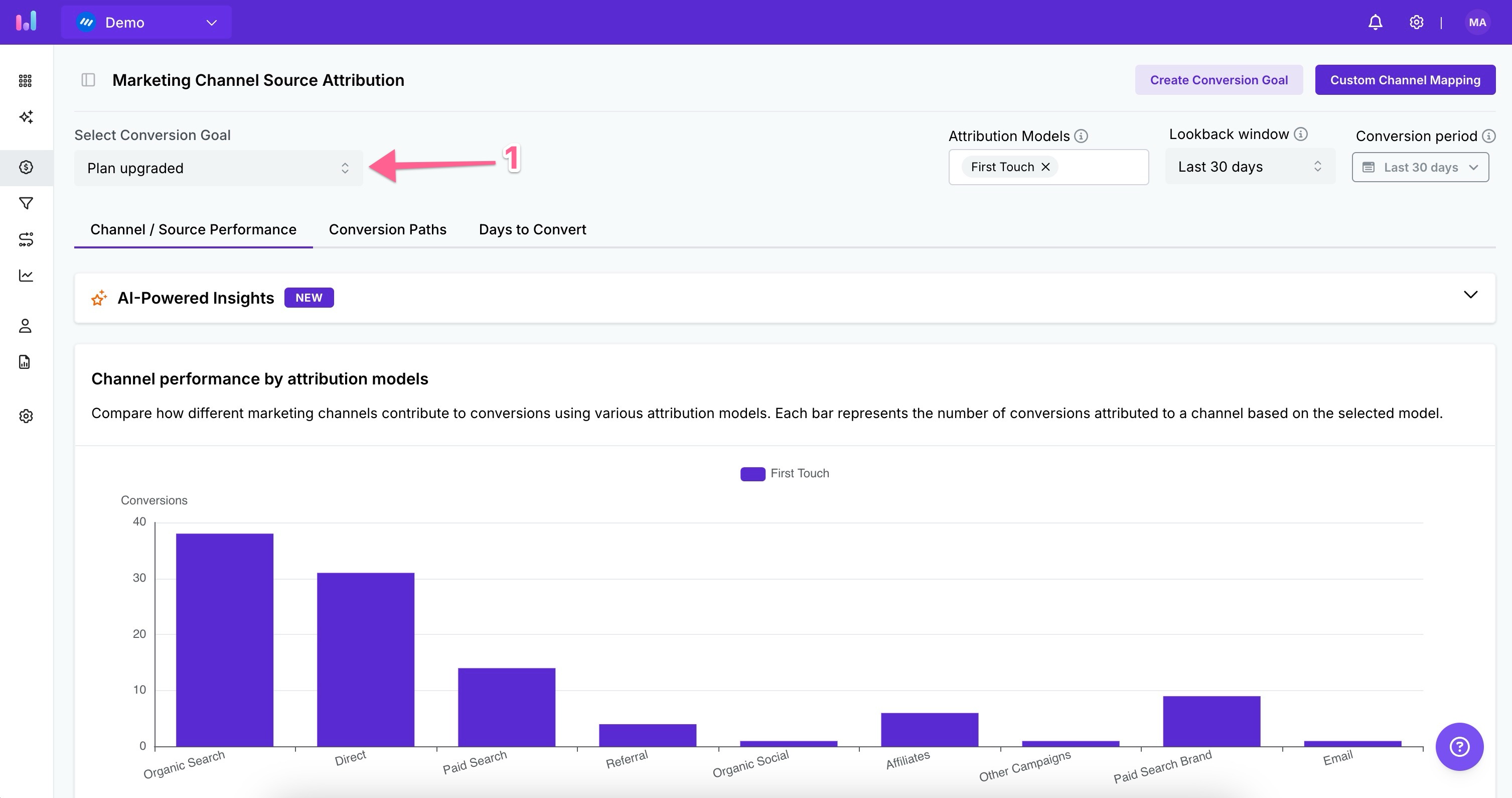 At the top left of the screen, you'll find a drop-down menu listing all your conversion goals. Simply select the conversion goal you want to analyze, and the dashboard will update to display the relevant attribution insights for that goal.