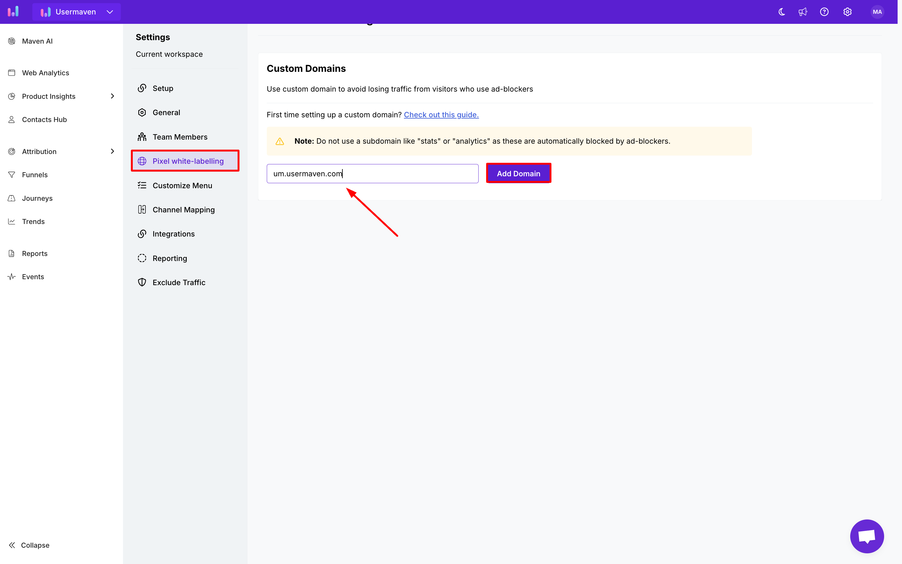 Ad blockers often block known analytics domains, which can lead to missing or inaccurate data. To solve this, Usermaven allows you to white-label the tracking pixel by using your own custom domain. This improves data reliability and helps bypass ad blockers.