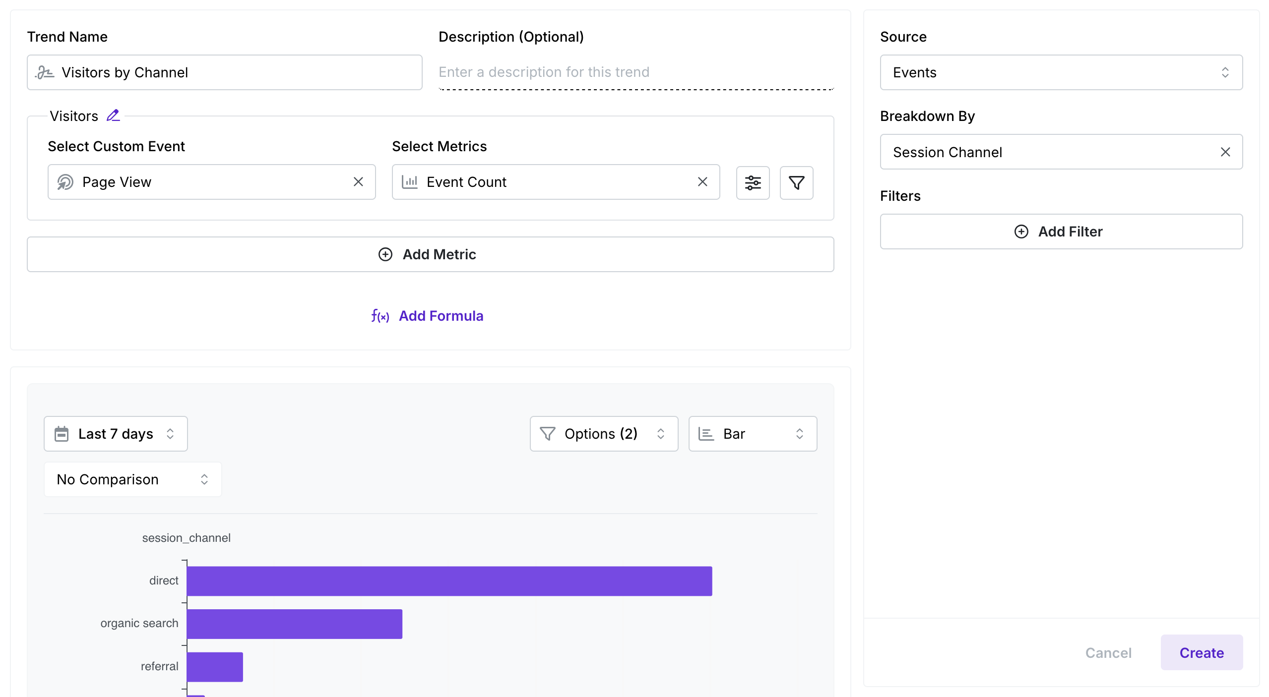 Manually configure every aspect, from choosing events and metrics to applying filters and breakdowns. Ideal for highly customized or complex analyses that aren’t covered by templates or AI.
