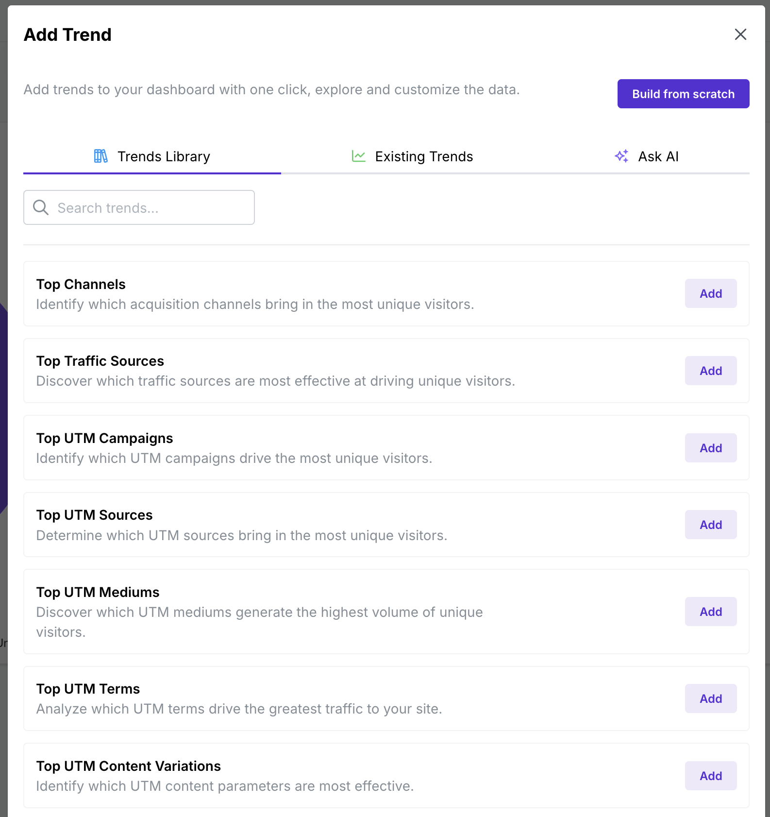 Take advantage of ready-made trend templates (e.g., “Top Channels,” “Top UTM Campaigns”) for instant insights. Simply select a template and add it to your dashboard with one click.
